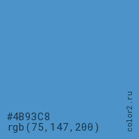 Цвет #4B93C8 в цветовой модели RGB обозначается тремя октетами (75, 147, 200) в десятичном формате и #4B93C8 в шестнадцатиричном (hex) формате, которые являются интенсивностью красного 75 (hex 4B), интенсивность зелёного 147 (hex 93) и интенсивность синего 200 (hex C8).