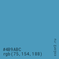 Цвет #4B9ABC в цветовой модели RGB обозначается тремя октетами (75, 154, 188) в десятичном формате и #4B9ABC в шестнадцатиричном (hex) формате, которые являются интенсивностью красного 75 (hex 4B), интенсивность зелёного 154 (hex 9A) и интенсивность синего 188 (hex BC).