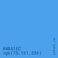 Цвет #4BA1EC в цветовой модели RGB обозначается тремя октетами (75, 161, 236) в десятичном формате и #4BA1EC в шестнадцатиричном (hex) формате, которые являются интенсивностью красного 75 (hex 4B), интенсивность зелёного 161 (hex A1) и интенсивность синего 236 (hex EC).