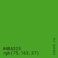 Цвет #4BA325 в цветовой модели RGB обозначается тремя октетами (75, 163, 37) в десятичном формате и #4BA325 в шестнадцатиричном (hex) формате, которые являются интенсивностью красного 75 (hex 4B), интенсивность зелёного 163 (hex A3) и интенсивность синего 37 (hex 25).