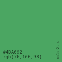 Цвет #4BA662 в цветовой модели RGB обозначается тремя октетами (75, 166, 98) в десятичном формате и #4BA662 в шестнадцатиричном (hex) формате, которые являются интенсивностью красного 75 (hex 4B), интенсивность зелёного 166 (hex A6) и интенсивность синего 98 (hex 62).