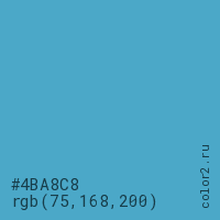 Цвет #4BA8C8 в цветовой модели RGB обозначается тремя октетами (75, 168, 200) в десятичном формате и #4BA8C8 в шестнадцатиричном (hex) формате, которые являются интенсивностью красного 75 (hex 4B), интенсивность зелёного 168 (hex A8) и интенсивность синего 200 (hex C8).