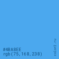 Цвет #4BA8EE в цветовой модели RGB обозначается тремя октетами (75, 168, 238) в десятичном формате и #4BA8EE в шестнадцатиричном (hex) формате, которые являются интенсивностью красного 75 (hex 4B), интенсивность зелёного 168 (hex A8) и интенсивность синего 238 (hex EE).