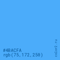 Цвет #4BACFA в цветовой модели RGB обозначается тремя октетами (75, 172, 250) в десятичном формате и #4BACFA в шестнадцатиричном (hex) формате, которые являются интенсивностью красного 75 (hex 4B), интенсивность зелёного 172 (hex AC) и интенсивность синего 250 (hex FA).