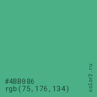 Цвет #4BB086 в цветовой модели RGB обозначается тремя октетами (75, 176, 134) в десятичном формате и #4BB086 в шестнадцатиричном (hex) формате, которые являются интенсивностью красного 75 (hex 4B), интенсивность зелёного 176 (hex B0) и интенсивность синего 134 (hex 86).