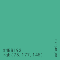 Цвет #4BB192 в цветовой модели RGB обозначается тремя октетами (75, 177, 146) в десятичном формате и #4BB192 в шестнадцатиричном (hex) формате, которые являются интенсивностью красного 75 (hex 4B), интенсивность зелёного 177 (hex B1) и интенсивность синего 146 (hex 92).