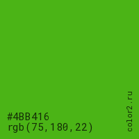Цвет #4BB416 в цветовой модели RGB обозначается тремя октетами (75, 180, 22) в десятичном формате и #4BB416 в шестнадцатиричном (hex) формате, которые являются интенсивностью красного 75 (hex 4B), интенсивность зелёного 180 (hex B4) и интенсивность синего 22 (hex 16).