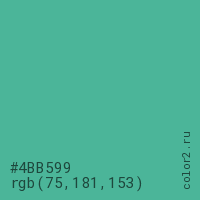 Цвет #4BB599 в цветовой модели RGB обозначается тремя октетами (75, 181, 153) в десятичном формате и #4BB599 в шестнадцатиричном (hex) формате, которые являются интенсивностью красного 75 (hex 4B), интенсивность зелёного 181 (hex B5) и интенсивность синего 153 (hex 99).