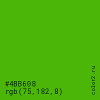 Цвет #4BB608 в цветовой модели RGB обозначается тремя октетами (75, 182, 8) в десятичном формате и #4BB608 в шестнадцатиричном (hex) формате, которые являются интенсивностью красного 75 (hex 4B), интенсивность зелёного 182 (hex B6) и интенсивность синего 8 (hex 08).