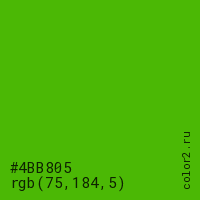 Цвет #4BB805 в цветовой модели RGB обозначается тремя октетами (75, 184, 5) в десятичном формате и #4BB805 в шестнадцатиричном (hex) формате, которые являются интенсивностью красного 75 (hex 4B), интенсивность зелёного 184 (hex B8) и интенсивность синего 5 (hex 05).