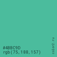 Цвет #4BBC9D в цветовой модели RGB обозначается тремя октетами (75, 188, 157) в десятичном формате и #4BBC9D в шестнадцатиричном (hex) формате, которые являются интенсивностью красного 75 (hex 4B), интенсивность зелёного 188 (hex BC) и интенсивность синего 157 (hex 9D).
