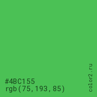 Цвет #4BC155 в цветовой модели RGB обозначается тремя октетами (75, 193, 85) в десятичном формате и #4BC155 в шестнадцатиричном (hex) формате, которые являются интенсивностью красного 75 (hex 4B), интенсивность зелёного 193 (hex C1) и интенсивность синего 85 (hex 55).