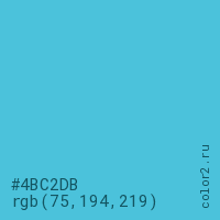 Цвет #4BC2DB в цветовой модели RGB обозначается тремя октетами (75, 194, 219) в десятичном формате и #4BC2DB в шестнадцатиричном (hex) формате, которые являются интенсивностью красного 75 (hex 4B), интенсивность зелёного 194 (hex C2) и интенсивность синего 219 (hex DB).