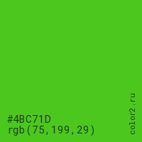 Цвет #4BC71D в цветовой модели RGB обозначается тремя октетами (75, 199, 29) в десятичном формате и #4BC71D в шестнадцатиричном (hex) формате, которые являются интенсивностью красного 75 (hex 4B), интенсивность зелёного 199 (hex C7) и интенсивность синего 29 (hex 1D).