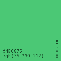 Цвет #4BC875 в цветовой модели RGB обозначается тремя октетами (75, 200, 117) в десятичном формате и #4BC875 в шестнадцатиричном (hex) формате, которые являются интенсивностью красного 75 (hex 4B), интенсивность зелёного 200 (hex C8) и интенсивность синего 117 (hex 75).