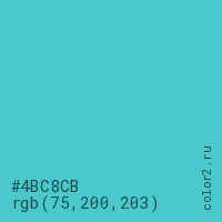Цвет #4BC8CB в цветовой модели RGB обозначается тремя октетами (75, 200, 203) в десятичном формате и #4BC8CB в шестнадцатиричном (hex) формате, которые являются интенсивностью красного 75 (hex 4B), интенсивность зелёного 200 (hex C8) и интенсивность синего 203 (hex CB).
