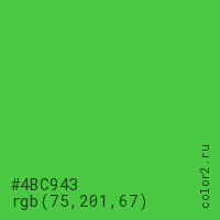 Цвет #4BC943 в цветовой модели RGB обозначается тремя октетами (75, 201, 67) в десятичном формате и #4BC943 в шестнадцатиричном (hex) формате, которые являются интенсивностью красного 75 (hex 4B), интенсивность зелёного 201 (hex C9) и интенсивность синего 67 (hex 43).