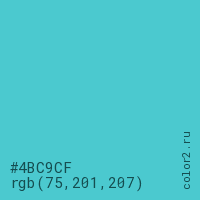 Цвет #4BC9CF в цветовой модели RGB обозначается тремя октетами (75, 201, 207) в десятичном формате и #4BC9CF в шестнадцатиричном (hex) формате, которые являются интенсивностью красного 75 (hex 4B), интенсивность зелёного 201 (hex C9) и интенсивность синего 207 (hex CF).
