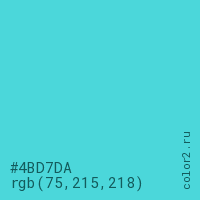 Цвет #4BD7DA в цветовой модели RGB обозначается тремя октетами (75, 215, 218) в десятичном формате и #4BD7DA в шестнадцатиричном (hex) формате, которые являются интенсивностью красного 75 (hex 4B), интенсивность зелёного 215 (hex D7) и интенсивность синего 218 (hex DA).