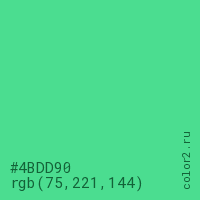 Цвет #4BDD90 в цветовой модели RGB обозначается тремя октетами (75, 221, 144) в десятичном формате и #4BDD90 в шестнадцатиричном (hex) формате, которые являются интенсивностью красного 75 (hex 4B), интенсивность зелёного 221 (hex DD) и интенсивность синего 144 (hex 90).