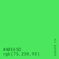 Цвет #4BE65D в цветовой модели RGB обозначается тремя октетами (75, 230, 93) в десятичном формате и #4BE65D в шестнадцатиричном (hex) формате, которые являются интенсивностью красного 75 (hex 4B), интенсивность зелёного 230 (hex E6) и интенсивность синего 93 (hex 5D).