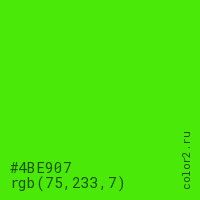 Цвет #4BE907 в цветовой модели RGB обозначается тремя октетами (75, 233, 7) в десятичном формате и #4BE907 в шестнадцатиричном (hex) формате, которые являются интенсивностью красного 75 (hex 4B), интенсивность зелёного 233 (hex E9) и интенсивность синего 7 (hex 07).