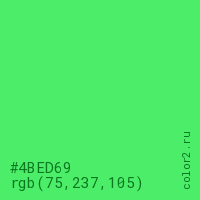 Цвет #4BED69 в цветовой модели RGB обозначается тремя октетами (75, 237, 105) в десятичном формате и #4BED69 в шестнадцатиричном (hex) формате, которые являются интенсивностью красного 75 (hex 4B), интенсивность зелёного 237 (hex ED) и интенсивность синего 105 (hex 69).