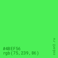 Цвет #4BEF56 в цветовой модели RGB обозначается тремя октетами (75, 239, 86) в десятичном формате и #4BEF56 в шестнадцатиричном (hex) формате, которые являются интенсивностью красного 75 (hex 4B), интенсивность зелёного 239 (hex EF) и интенсивность синего 86 (hex 56).