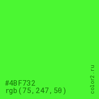 Цвет #4BF732 в цветовой модели RGB обозначается тремя октетами (75, 247, 50) в десятичном формате и #4BF732 в шестнадцатиричном (hex) формате, которые являются интенсивностью красного 75 (hex 4B), интенсивность зелёного 247 (hex F7) и интенсивность синего 50 (hex 32).