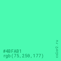 Цвет #4BFAB1 в цветовой модели RGB обозначается тремя октетами (75, 250, 177) в десятичном формате и #4BFAB1 в шестнадцатиричном (hex) формате, которые являются интенсивностью красного 75 (hex 4B), интенсивность зелёного 250 (hex FA) и интенсивность синего 177 (hex B1).