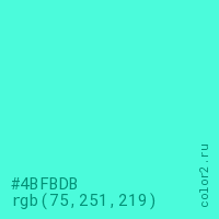 Цвет #4BFBDB в цветовой модели RGB обозначается тремя октетами (75, 251, 219) в десятичном формате и #4BFBDB в шестнадцатиричном (hex) формате, которые являются интенсивностью красного 75 (hex 4B), интенсивность зелёного 251 (hex FB) и интенсивность синего 219 (hex DB).