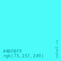 Цвет #4BFBF9 в цветовой модели RGB обозначается тремя октетами (75, 251, 249) в десятичном формате и #4BFBF9 в шестнадцатиричном (hex) формате, которые являются интенсивностью красного 75 (hex 4B), интенсивность зелёного 251 (hex FB) и интенсивность синего 249 (hex F9).