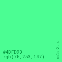 Цвет #4BFD93 в цветовой модели RGB обозначается тремя октетами (75, 253, 147) в десятичном формате и #4BFD93 в шестнадцатиричном (hex) формате, которые являются интенсивностью красного 75 (hex 4B), интенсивность зелёного 253 (hex FD) и интенсивность синего 147 (hex 93).