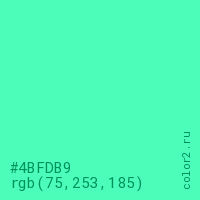 Цвет #4BFDB9 в цветовой модели RGB обозначается тремя октетами (75, 253, 185) в десятичном формате и #4BFDB9 в шестнадцатиричном (hex) формате, которые являются интенсивностью красного 75 (hex 4B), интенсивность зелёного 253 (hex FD) и интенсивность синего 185 (hex B9).