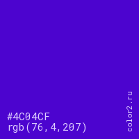 Цвет #4C04CF в цветовой модели RGB обозначается тремя октетами (76, 4, 207) в десятичном формате и #4C04CF в шестнадцатиричном (hex) формате, которые являются интенсивностью красного 76 (hex 4C), интенсивность зелёного 4 (hex 04) и интенсивность синего 207 (hex CF).