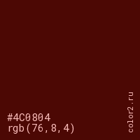 Цвет #4C0804 в цветовой модели RGB обозначается тремя октетами (76, 8, 4) в десятичном формате и #4C0804 в шестнадцатиричном (hex) формате, которые являются интенсивностью красного 76 (hex 4C), интенсивность зелёного 8 (hex 08) и интенсивность синего 4 (hex 04).