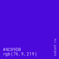Цвет #4C09DB в цветовой модели RGB обозначается тремя октетами (76, 9, 219) в десятичном формате и #4C09DB в шестнадцатиричном (hex) формате, которые являются интенсивностью красного 76 (hex 4C), интенсивность зелёного 9 (hex 09) и интенсивность синего 219 (hex DB).