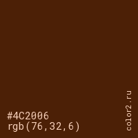 Цвет #4C2006 в цветовой модели RGB обозначается тремя октетами (76, 32, 6) в десятичном формате и #4C2006 в шестнадцатиричном (hex) формате, которые являются интенсивностью красного 76 (hex 4C), интенсивность зелёного 32 (hex 20) и интенсивность синего 6 (hex 06).