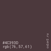 Цвет #4C393D в цветовой модели RGB обозначается тремя октетами (76, 57, 61) в десятичном формате и #4C393D в шестнадцатиричном (hex) формате, которые являются интенсивностью красного 76 (hex 4C), интенсивность зелёного 57 (hex 39) и интенсивность синего 61 (hex 3D).