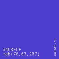 Цвет #4C3FCF в цветовой модели RGB обозначается тремя октетами (76, 63, 207) в десятичном формате и #4C3FCF в шестнадцатиричном (hex) формате, которые являются интенсивностью красного 76 (hex 4C), интенсивность зелёного 63 (hex 3F) и интенсивность синего 207 (hex CF).