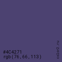 Цвет #4C4271 в цветовой модели RGB обозначается тремя октетами (76, 66, 113) в десятичном формате и #4C4271 в шестнадцатиричном (hex) формате, которые являются интенсивностью красного 76 (hex 4C), интенсивность зелёного 66 (hex 42) и интенсивность синего 113 (hex 71).