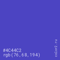 Цвет #4C44C2 в цветовой модели RGB обозначается тремя октетами (76, 68, 194) в десятичном формате и #4C44C2 в шестнадцатиричном (hex) формате, которые являются интенсивностью красного 76 (hex 4C), интенсивность зелёного 68 (hex 44) и интенсивность синего 194 (hex C2).