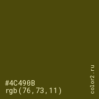 Цвет #4C490B в цветовой модели RGB обозначается тремя октетами (76, 73, 11) в десятичном формате и #4C490B в шестнадцатиричном (hex) формате, которые являются интенсивностью красного 76 (hex 4C), интенсивность зелёного 73 (hex 49) и интенсивность синего 11 (hex 0B).