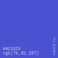 Цвет #4C52CF в цветовой модели RGB обозначается тремя октетами (76, 82, 207) в десятичном формате и #4C52CF в шестнадцатиричном (hex) формате, которые являются интенсивностью красного 76 (hex 4C), интенсивность зелёного 82 (hex 52) и интенсивность синего 207 (hex CF).