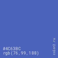Цвет #4C63BC в цветовой модели RGB обозначается тремя октетами (76, 99, 188) в десятичном формате и #4C63BC в шестнадцатиричном (hex) формате, которые являются интенсивностью красного 76 (hex 4C), интенсивность зелёного 99 (hex 63) и интенсивность синего 188 (hex BC).