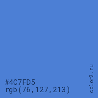 Цвет #4C7FD5 в цветовой модели RGB обозначается тремя октетами (76, 127, 213) в десятичном формате и #4C7FD5 в шестнадцатиричном (hex) формате, которые являются интенсивностью красного 76 (hex 4C), интенсивность зелёного 127 (hex 7F) и интенсивность синего 213 (hex D5).