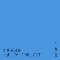 Цвет #4C96DF в цветовой модели RGB обозначается тремя октетами (76, 150, 223) в десятичном формате и #4C96DF в шестнадцатиричном (hex) формате, которые являются интенсивностью красного 76 (hex 4C), интенсивность зелёного 150 (hex 96) и интенсивность синего 223 (hex DF).