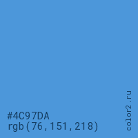 Цвет #4C97DA в цветовой модели RGB обозначается тремя октетами (76, 151, 218) в десятичном формате и #4C97DA в шестнадцатиричном (hex) формате, которые являются интенсивностью красного 76 (hex 4C), интенсивность зелёного 151 (hex 97) и интенсивность синего 218 (hex DA).