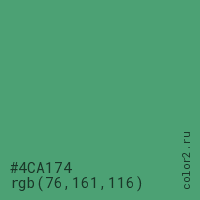 Цвет #4CA174 в цветовой модели RGB обозначается тремя октетами (76, 161, 116) в десятичном формате и #4CA174 в шестнадцатиричном (hex) формате, которые являются интенсивностью красного 76 (hex 4C), интенсивность зелёного 161 (hex A1) и интенсивность синего 116 (hex 74).