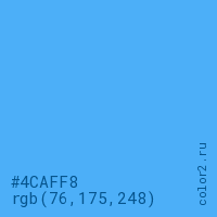 Цвет #4CAFF8 в цветовой модели RGB обозначается тремя октетами (76, 175, 248) в десятичном формате и #4CAFF8 в шестнадцатиричном (hex) формате, которые являются интенсивностью красного 76 (hex 4C), интенсивность зелёного 175 (hex AF) и интенсивность синего 248 (hex F8).